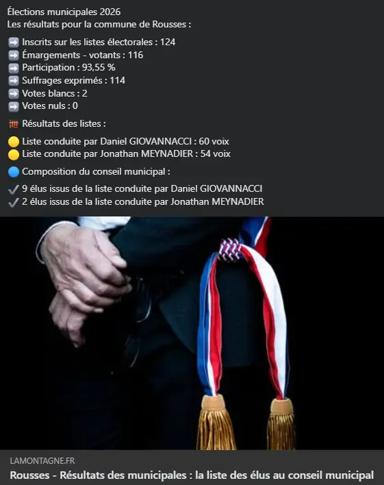 Les informations relatives aux listes ainsi qu’aux affiches pour les élections municipales de 2026 vous sont communiquées dès leur réception. Dans un souci d’équité, à défaut de transmission officielle, ces données sont recueillies par le biais des réseaux sociaux.