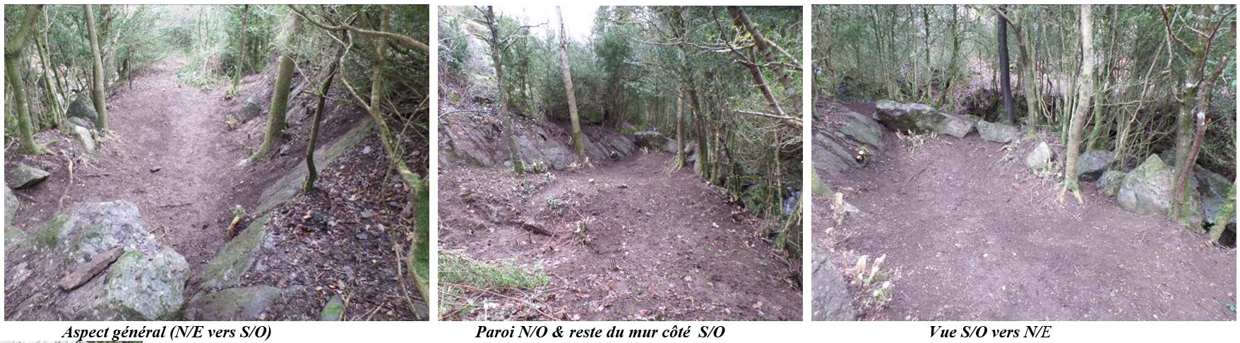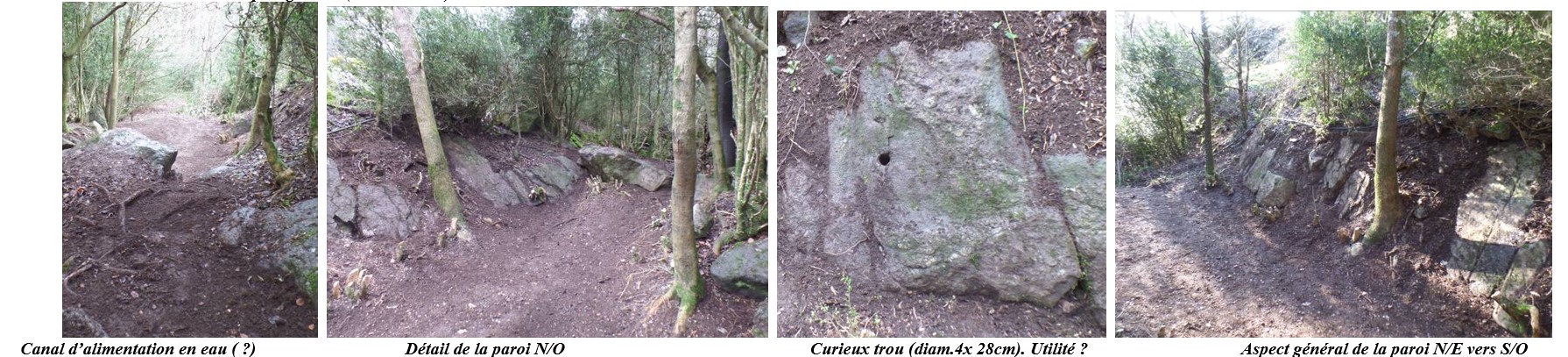 J’ai observé, vers l’aval, un curieux trou, taillé dans la roche, bien régulier et étroit (4cm de diamètre, 28cm de profondeur, et 45° au-dessus de l’horizontal) comme percé avec une grosse mèche carbure. Son utilité nous échappe, mais elle devait avoir une certaine importance, car sa réalisation, avec les moyens de l’époque, représente une véritable prouesse technique