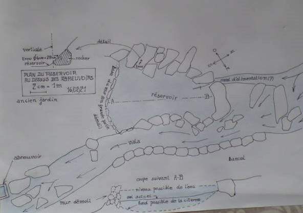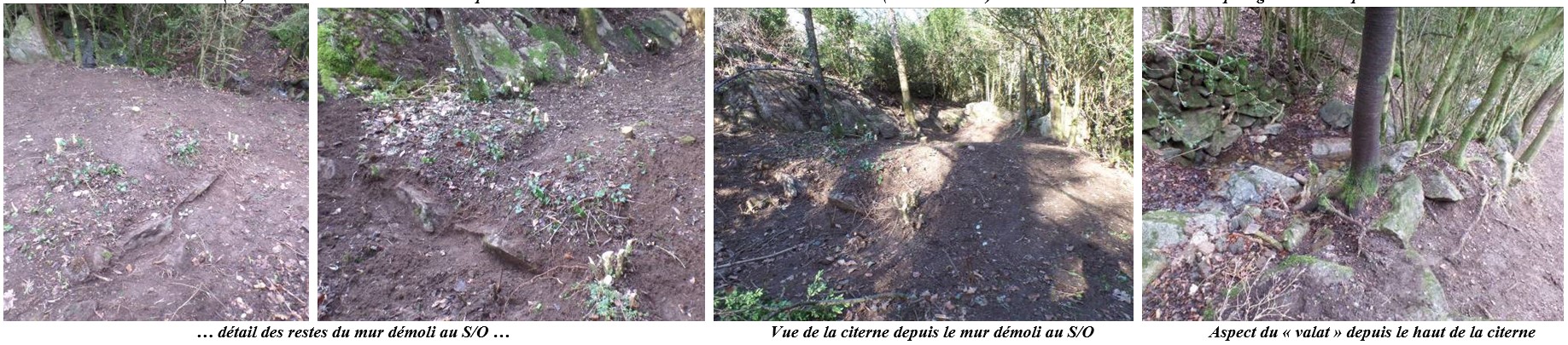 Probablement assez ancienne qui n’a pas laissé beaucoup de souvenirs à Jean Claude MARTIN, car elle ne fonctionnait déjà plus quand il était enfant. Les parois, situées dans l’axe de la pente, sont constituées d’énormes blocs de pierres d’origine naturelle. Par contre le barrage, perpendiculaire à la pente, qui la fermait en aval, avait été construit par l’homme, avec des blocs plus petits qui n’ont pas résisté aux eaux furieuses des épisodes cévenols. Il ne reste plus que quelques pierres pour en indiquer le tracé. Le fait qu’on voit encore distinctement le changement de niveaux, entre la terre qui s’est accumulée à l’intérieur de la citerne après son abandon, et le pré situé au pied du barrage, indique que la disparition presque totale de ce dernier n’est pas très ancienne (Jean Claude se souvient qu’il avait une forme arrondie). Elle s’est sans doute accélérée, lorsque des vaches ont pris possession des lieux. Il est également difficile de voir distinctement où se trouvait le branchement entre le « Vala » et son canal d’alimentation