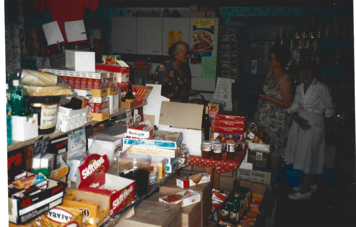 Peu à peu la liste des produits mise en vente c’est enrichi et en trouver presque de tout dans cette petite boutique dans laquelle on faisait aussi la cuisine. Des aliments de longue conservation: lentilles , pois chiche, pois cassés, quelques boîtes de conserves, pâté, puis des paquets de biscuit et du chocolat, du café en grain brûlé ou vert ( certaines personnes le tarifié elle-même )