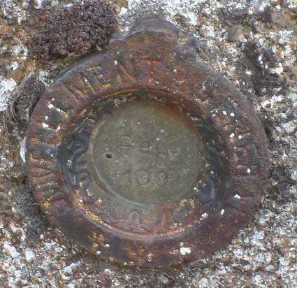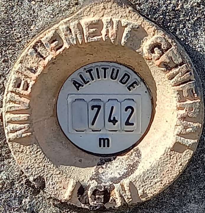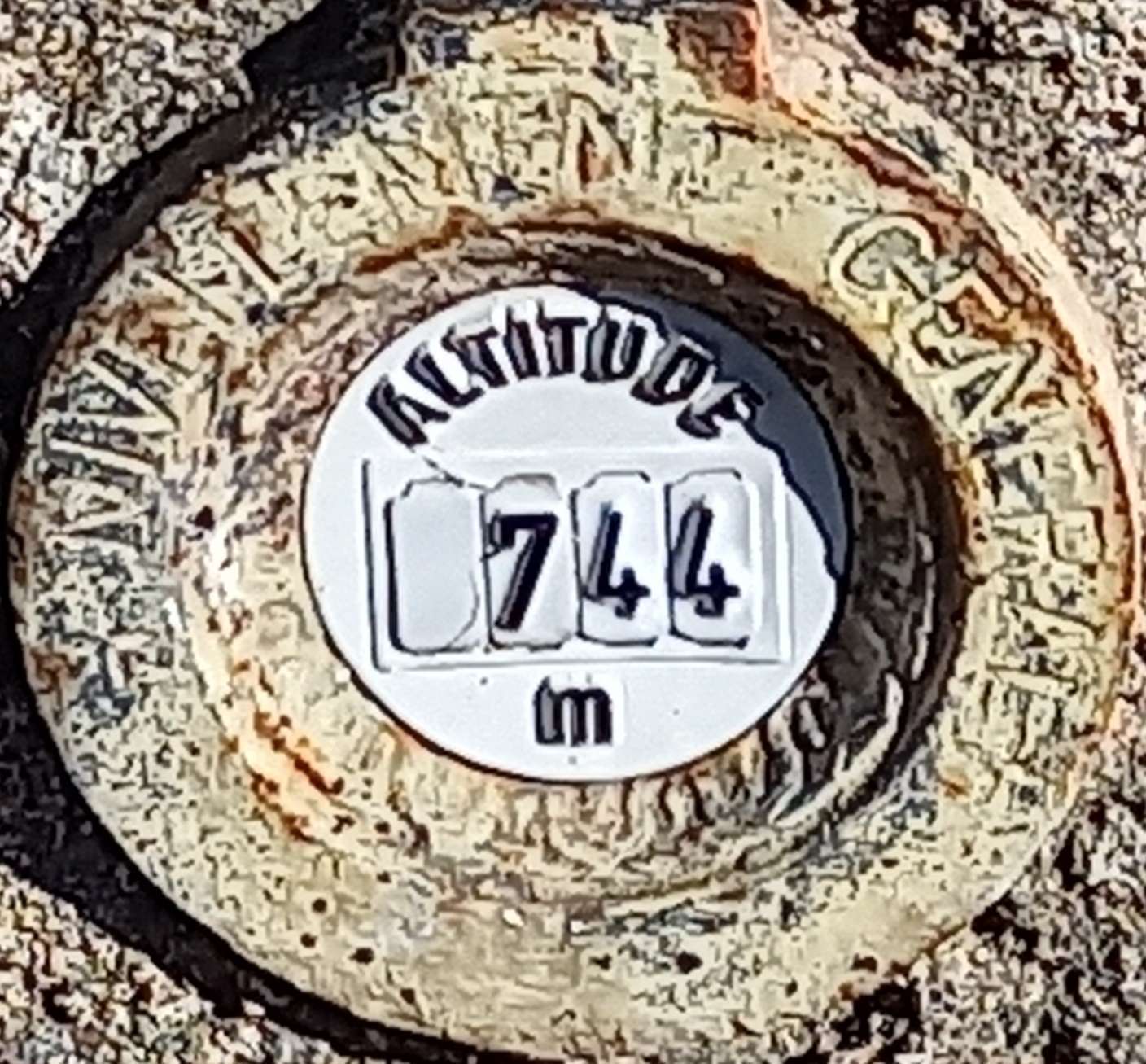 Voici un repère de nivellement récent de type médaillon muni d’une plaquette altitudinale. L’altitude d’un repère de nivellement est susceptible d’évoluer au cours du temps. Pour éviter de changer la plaquette altitudinale à chaque opération de nivellement et inciter à utiliser l’altitude la plus à jour, disponible sur la fiche signalétique du repère, l’altitude marquée sur le repère est arrondie au mètre.