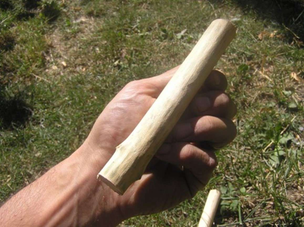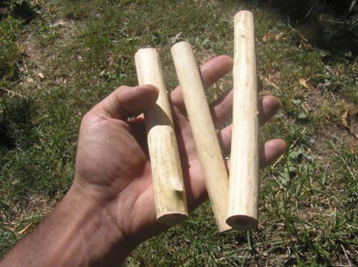 En musique verte il faut chercher l’équivalent. De tous mes essais, à ce jour c’est le bois de sureau qui a donné les résultats les plus probants (mais à priori tous les bois un peu durs peuvent faire l’affaire, le Buis par exemple sera très bien aussi). Choisir donc des rameaux assez épais (de 1 à 2 cm), les couper sur 10 à 20 cm de long, les écorcer. Le son sera meilleur lorsque le bois aura séché, et donc durci (faites aussi des essais avec des rameaux morts si vous en trouvez, cela vous épargnera l’attente du séchage).