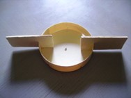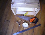 Une cagette (en bois) – une boîte de camembert (en bois) – une pique à brochette (en bois) – 2 morceaux de bois en forme de Y – une scie – de la colle – une grande règle – un clou – un compas
