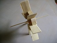 Attention, il ne faut pas coller la pique. Elle constitue l’axe autour duquel le moulin tourne. Si on la colle, ça ne tournera pas. Si jamais le trou est un peu trop gros et que la pique bouge un peu, il faut la coincer avec un cure-dent ou une allumette.