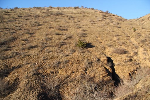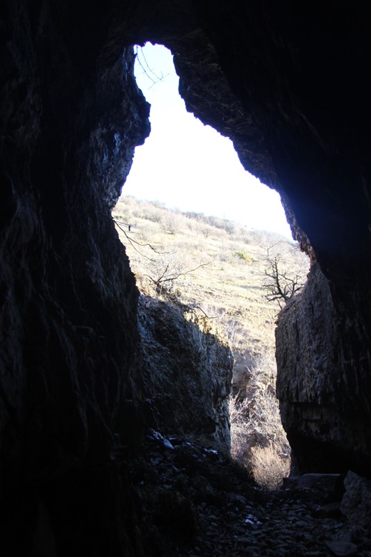 Pendant la montée, l’entrée de la grotte apparaît, simple fissure noire au pied d’un versant pelé