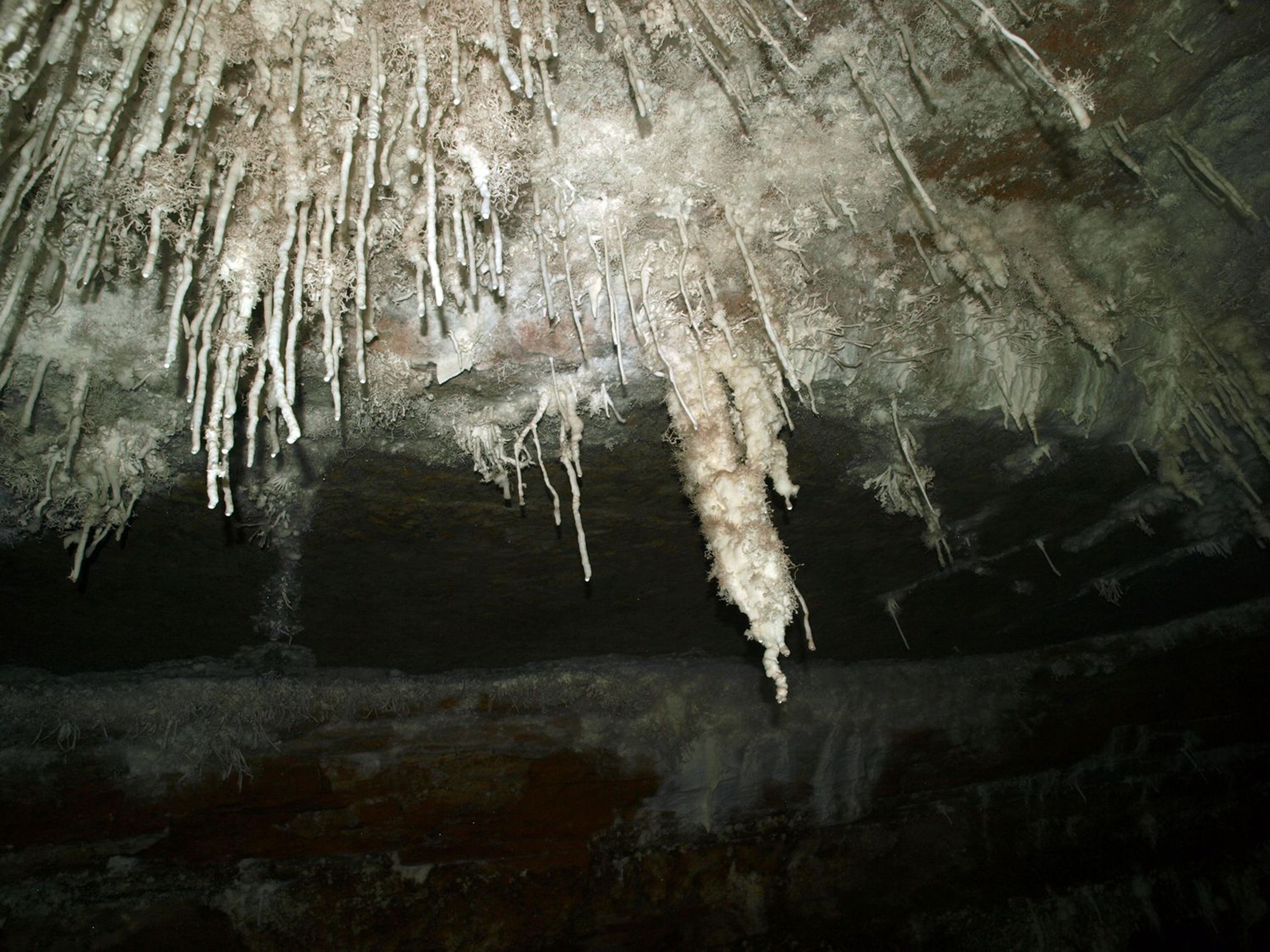 Pour faciliter leurs allées et venues, les géologues posent des échelles métalliques fixes aux passages les plus escarpés, et installent des passerelles de bois au dessus de la rivière. Le principe de construction est sommaire mais efficace : à espaces réguliers (3 mètres ?) des poutres sont coincées entre les deux parois de la grotte, à quelques décimètres ou quelques mètres au dessus de l’eau. Sur ces montants sont posées des poutres perpendiculaires qui constitueront la passerelle. Pour y avoir marché moi-même au début des années 2000, je crois me souvenir que les pièces de bois utilisées étaient tout simplement des traverses de chemin de fer. Près d’un kilomètre de passerelle furent ainsi progressivement construites, important dans la grotte d’énormes quantités de bois qui posèrent bien des problèmes par la suite.